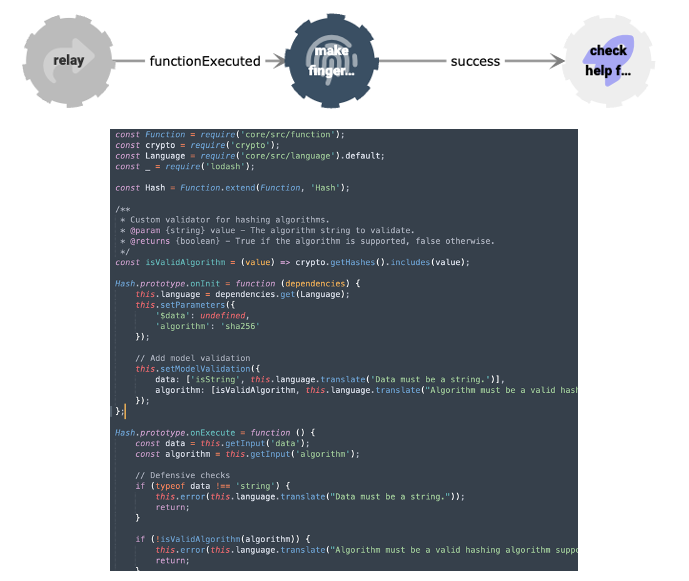 Our architecture leverages Graphileon’s Function-Trigger-Infrastructure to create a seamless event-driven pipeline. When a “relay” trigger fires the functionExecuted event, the Hash function processes the input and routes to either success handlers or error management, all defined declaratively in code. The implementation includes robust parameter management, custom validators for algorithms, and defensive type-checking to ensure data integrity throughout the flow.